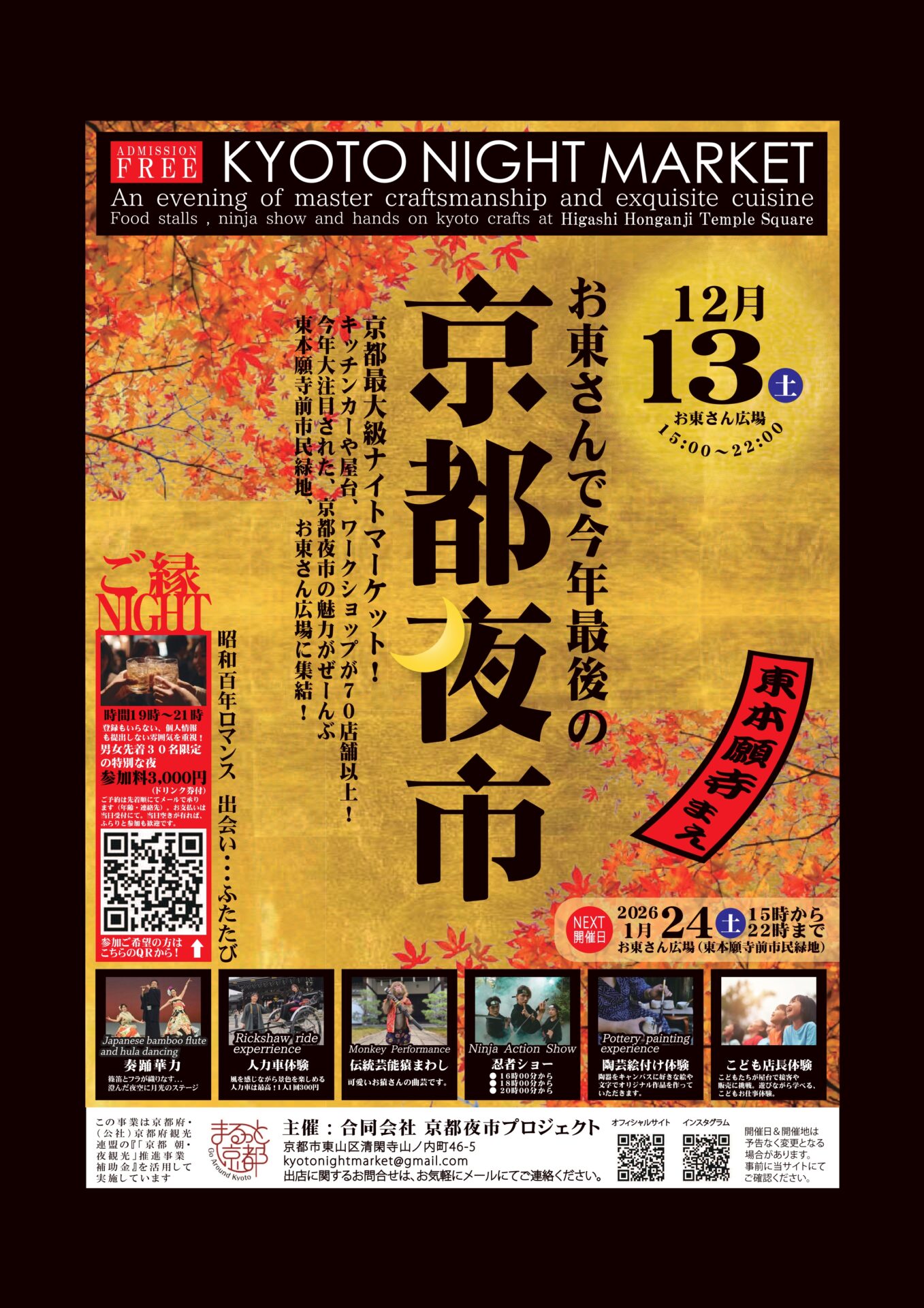 Join us on December 13 (Sat) 15:00–22:00 at Otosan Hiroba in front of Higashi Honganji Temple.